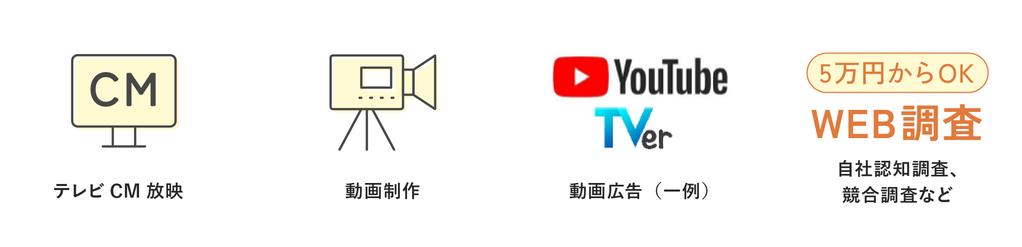 | 1,000万円 | 100万円 | 【動画がある場合】テレビCM、TVer、YouTube、映画館CM、交通広告など 【動画がない場合】特設サイト制作(LP)、ラジオ、イベント協賛など WEB調査(自社認知調査、競合調査など) |